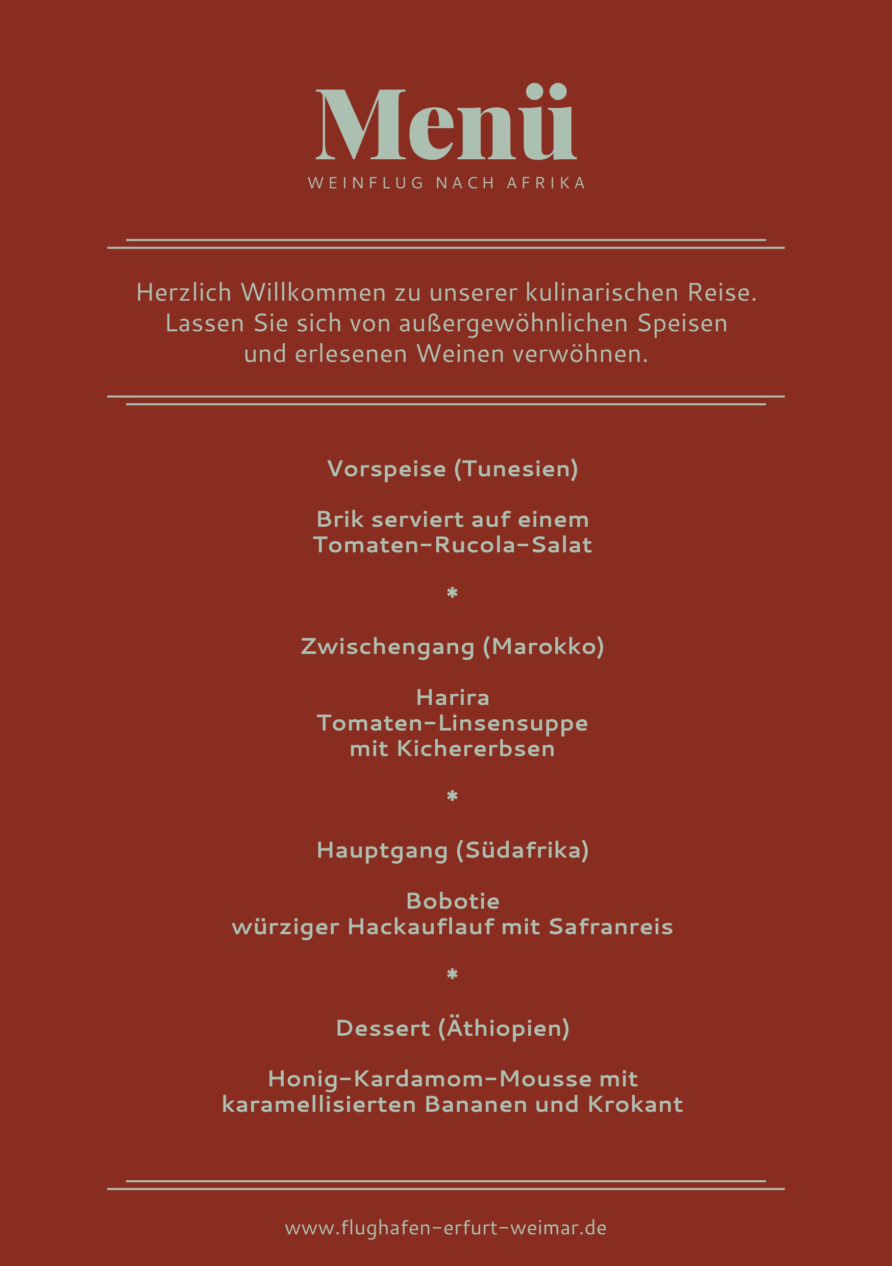 Erleben Sie eine außergewöhnliche Weinreise nach Afrika – direkt am Flughafen Erfurt-Weimar. Unter dem Motto „Weinflug“ laden wir Sie ein zu einem stilvollen Abend, bei dem kulinarischer Genuss auf Reisegefühl trifft.